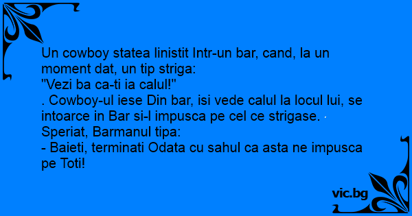 Un cowboy statea linistit Intr-un bar, cand, la un moment dat, un tip striga: