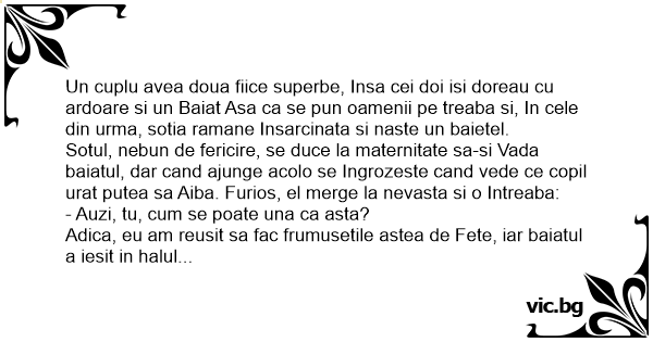 Un cuplu avea doua fiice superbe, Insa cei doi isi doreau cu ardoare si un Baiat Asa ca se pun oamenii pe treaba si, In cele din urma, sotia ramane Insarcinata si naste un baietel.