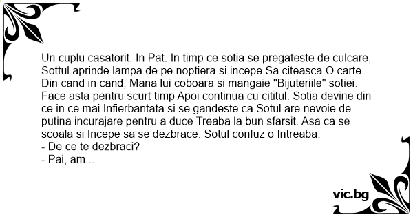 Un cuplu casatorit. In Pat. In timp ce sotia se pregateste de culcare, Sottul aprinde lampa de pe noptiera si incepe Sa citeasca O carte. Din cand in cand, Mana lui coboara si mangaie "Bijuteriile" sotiei. Face asta pentru scurt timp Apoi continua cu cititul. Sotia devine din ce in ce mai Infierbantata si se gandeste ca Sotul are nevoie de putina incurajare pentru a duce Treaba la bun sfarsit. Asa ca se scoala si Incepe sa se dezbrace. Sotul confuz o Intreaba: