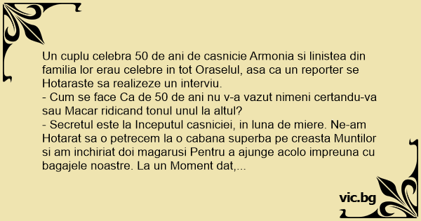 Un cuplu celebra 50 de ani de casnicie Armonia si linistea din familia lor erau celebre in tot Oraselul, asa ca un reporter se Hotaraste sa realizeze un interviu.