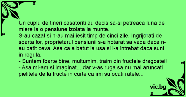 S-au cazat si n-au mai iesit timp de cinci zile. Ingrijorati de soarta lor, proprietarul pensiunii s-a hotarat sa vada daca n-au patit ceva. Asa ca a batut la usa si i-a intrebat daca sunt in regula.