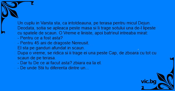 Un cuplu in Varsta sta, ca intotdeauna, pe terasa pentru micul Dejun. Deodata, sotia se apleaca peste masa si Ii trage sotului una de-l lipeste cu spatele de scaun. O Vreme e liniste, apoi batr\nul intreaba mirat: