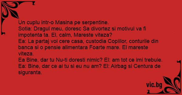 Sotia: Dragul meu, doresc Sa divortez si motivul va fi impotenta ta. El, calm, Mareste viteza?