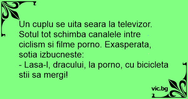 Un cuplu se uita seara la televizor. Sotul tot schimba canalele intre ciclism si filme роrnо. Exasperata, sotia izbucneste: