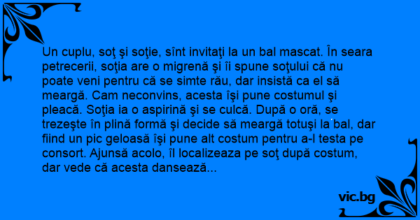 Un cuplu, soţ şi soţie, sînt invitaţi la un bal mascat. În seara petrecerii, soţia are o migrenă şi îi spune soţului că nu poate veni pentru că se simte rău, dar insistă ca el să meargă. Cam neconvins, acesta îşi pune costumul şi pleacă. Soţia ia o aspirină şi se culcă. După o oră, se trezeşte în plină formă şi decide să meargă totuşi la bal, dar fiind un pic geloasă îşi pune alt costum pentru a-l testa pe consort. Ajunsă acolo, îl localizeaza pe soţ după costum, dar vede că acesta dansează cu altă femeie, apoi cu alta, şi alta, cu gesturi destul de indecente. Se îndreaptă şi ea spre el, tipul n-o recunoaşte, iar ea îi propune să se ducă în altă cameră şi să faca sеx. El acceptă şi dupa ce scena se consumă femeia pleacă repede acasă, se schimbă şi între timp vine şi soţul.