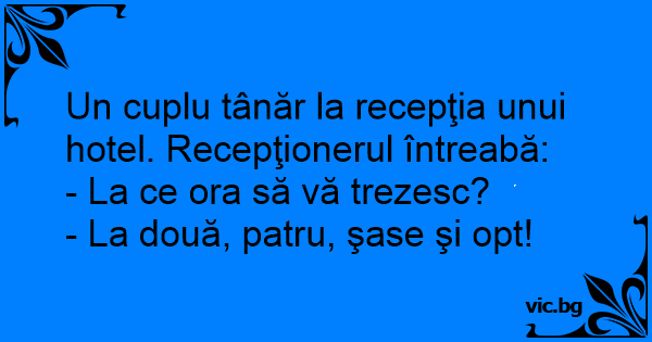 Un cuplu tânăr la recepţia unui hotel. Recepţionerul întreabă: