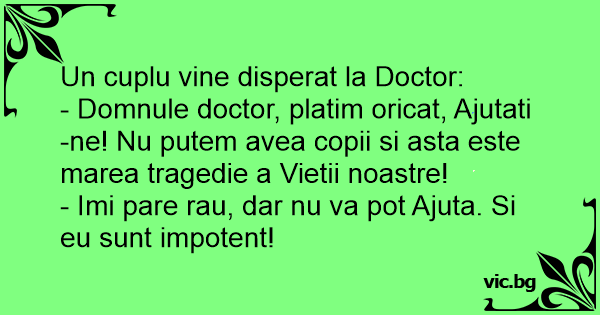 - Domnule doctor, platim oricat, Ajutati-ne! Nu putem avea copii si asta este marea tragedie a Vietii noastre!