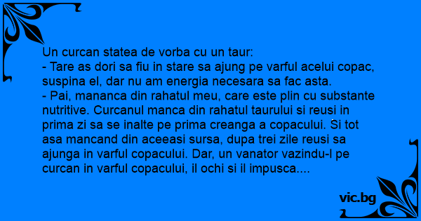 - Pai, mananca din rahatul meu, care este plin cu substante nutritive. Curcanul manca din rahatul taurului si reusi in prima zi sa se inalte pe prima creanga a copacului. Si tot asa mancand din aceeasi sursa, dupa trei zile reusi sa ajunga in varful copacului. Dar, un vanator vazindu-l pe curcan in varful copacului, il ochi si il impusca.