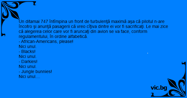 Un ditamai 747 întîmpina un front de turbulenţă maximă aşa că pilotul n-are încotro şi anunţă pasagerii că vreo cîţiva dintre ei vor fi sacrificaţi. Le mai zice că alegerea celor care vor fi aruncaţi din avion se va face, conform regulamentului, în ordine alfabetică.