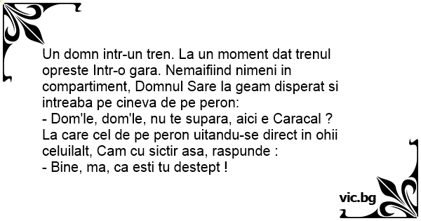 Un domn intr-un tren. La un moment dat trenul opreste Intr-o gara. Nemaifiind nimeni in compartiment, Domnul Sare la geam disperat si intreaba pe cineva de pe peron: