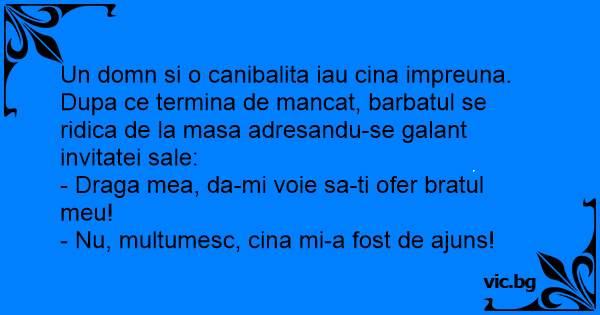 Un domn si o canibalita iau cina impreuna. Dupa ce termina de mancat, barbatul se ridica de la masa adresandu-se galant invitatei sale: