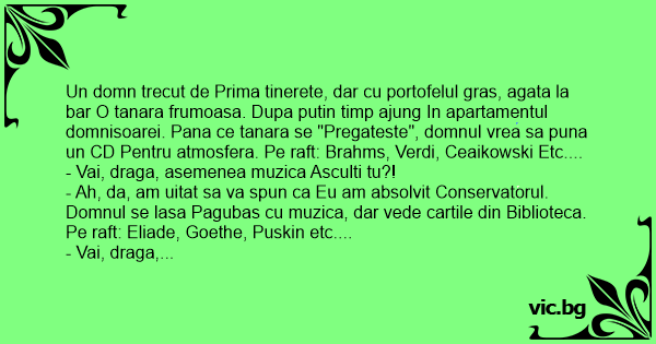 Un domn trecut de Prima tinerete, dar cu portofelul gras, agata la bar O tanara frumoasa. Dupa putin timp ajung In apartamentul domnisoarei. Pana ce tanara se "Pregateste", domnul vrea sa puna un CD Pentru atmosfera. Pe raft: Brahms, Verdi, Ceaikowski Etc....