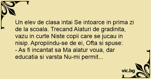 Un elev de clasa intai Se intoarce in prima zi de la scoala. Trecand Alaturi de gradinita, vazu in curte Niste copii care se jucau in nisip. Apropiindu-se de ei, Ofta si spuse: