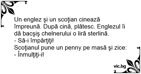 Un englez şi un scoţian cinează împreună. După cină, plătesc. Englezul îi dă bacşiş chelnerului o liră sterlină.
