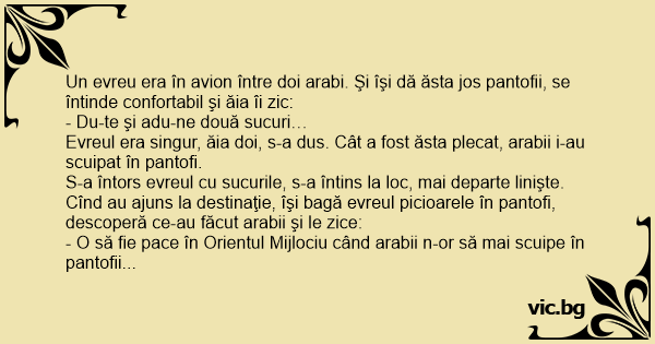 Un evreu era în avion între doi arabi. Şi îşi dă ăsta jos pantofii, se întinde confortabil şi ăia îi zic: