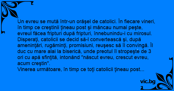 Un evreu se mută într-un orăşel de catolici. În fiecare vineri, în timp ce creştinii ţineau post şi mâncau numai peşte, evreul făcea fripturi după fripturi, înnebunindu-i cu mirosul. Disperaţi, catolicii se decid să-l convertească şi, după ameninţări, rugăminţi, promisiuni, reuşesc să îl convingă. Îl duc cu mare alai la biserică, unde preotul îl stropeşte de 3 ori cu apă sfinţită, intonând "născut evreu, crescut evreu, acum creştin".