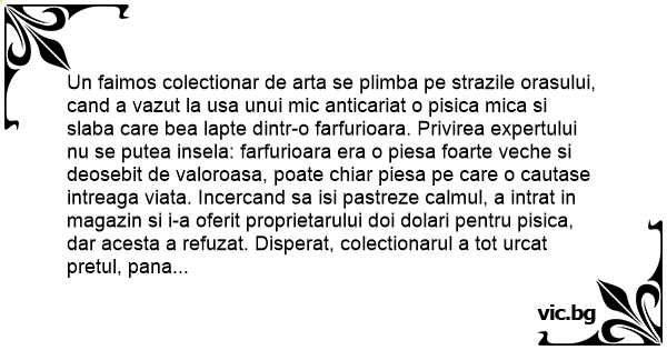 Un faimos colectionar de arta se plimba pe strazile orasului, cand a vazut la usa unui mic anticariat o pisica mica si slaba care bea lapte dintr-o farfurioara. Privirea expertului nu se putea insela: farfurioara era o piesa foarte veche si deosebit de valoroasa, poate chiar piesa pe care o cautase intreaga viata. Incercand sa isi pastreze calmul, a intrat in magazin si i-a oferit proprietarului doi dolari pentru pisica, dar acesta a refuzat. Disperat, colectionarul a tot urcat pretul, pana la 20 de dolari. Vanzatorul a luat banii si i-a pus pisica in brate. Proaspatul proprietar al felinei s-a uitat la farfurioara si pe un ton nepasator a spus: