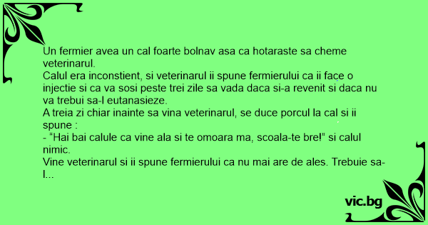 Un fermier avea un cal foarte bolnav asa ca hotaraste sa cheme veterinarul. Calul era inconstient, si veterinarul ii spune fermierului ca ii face o injectie si ca va sosi peste trei zile sa vada daca si-a revenit si daca nu va trebui sa-l eutanasieze. A treia zi chiar inainte sa vina veterinarul, se duce porcul la cal si ii spune : - “Hai bai calule ca vine ala si te omoara ma, scoala-te bre!” si calul nimic. Vine veterinarul si ii spune fermierului ca nu mai are de ales. Trebuie sa-l omoare. Fermierul disperat il roaga pe veterinar sa-l mai lase macar o zi. Acesta este de acord. A doua zi iarasi chiar inainte sa vina veterinarul porcul iar se duce la cal si ii spune aceleasi lucruri. Tocmai cand sa-l omoare, calul incepe sa sara, sa faca zgomote, se ridica si neacheaza o data puternic. Fericit, fermierul : - “Uhuuu, s-a trezit calul. Sa sarbatorim, aduceti bautura. Hai sa taiem porcul!”