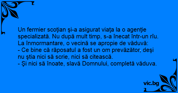 Un fermier scoţian şi-a asigurat viaţa la o agenţie specializată. Nu după mult timp, s-a înecat într-un rîu. La înmormantare, o vecină se apropie de văduvă: