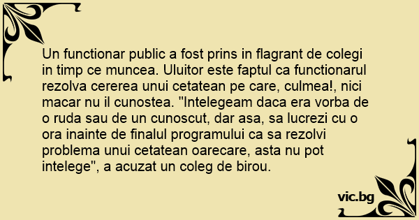 Un functionar public a fost prins in flagrant de colegi in timp ce muncea. Uluitor este faptul ca functionarul rezolva cererea unui cetatean pe care, culmea!, nici macar nu il cunostea. "Intelegeam daca era vorba de o ruda sau de un cunoscut, dar asa, sa lucrezi cu o ora inainte de finalul programului ca sa rezolvi problema unui cetatean oarecare, asta nu рот intelege", a acuzat un coleg de birou.