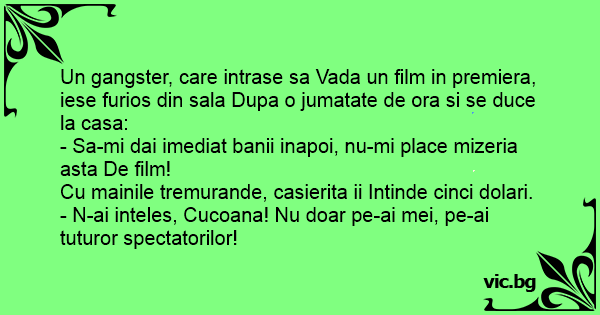 Un gangster, care intrase sa Vada un film in premiera, iese furios din sala Dupa o jumatate de ora si se duce la casa: