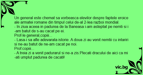 - A treia zi a venit padurarul si ne-a zis:Plecati dracului de aici ca mi-ati umplut padurea de cacati!