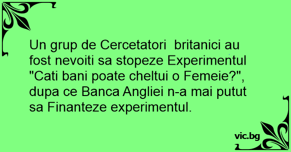 Un grup de Cercetatori britanici au fost nevoiti sa stopeze Experimentul "Cati bani poate cheltui o Femeie?", dupa ce Banca Angliei n-a mai putut sa Finanteze experimentul.
