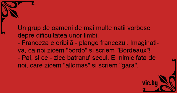- Franceza e oribilã - plange francezul. Imaginati-va, ca noi zicem "bordo" si scriem "Bordeaux"!