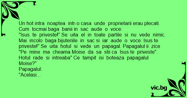"Isus te priveste!" Se uita el in toate partile si nu vede nimic. Mai incolo baga bijuteriile in sac si iar aude o voce: Isus te priveste!" Se uita hotul si vede un papagal. Papagalul ii zice "Pe mine ma cheama Moise da sa stii ca Isus te priveste". Hotul rade si intreaba" Ce tampit isi boteaza papagalul Moise?"