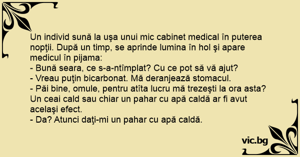 - Păi bine, omule, pentru atîta lucru mă trezeşti la ora asta? Un ceai cald sau chiar un pahar cu apă caldă ar fi avut acelaşi efect.