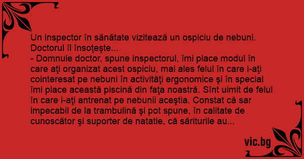 - Domnule doctor, spune inspectorul, îmi place modul în care aţi organizat acest ospiciu, mai ales felul în care i-aţi cointeresat pe nebuni în activităţi ergonomice şi în special îmi place această piscină din faţa noastră. Sînt uimit de felul în care i-aţi antrenat pe nebunii aceştia. Constat că sar impecabil de la trambulină şi рот spune, în calitate de cunoscător şi suporter de natatie, că săriturile au chiar un coeficient crescut de dificultate...