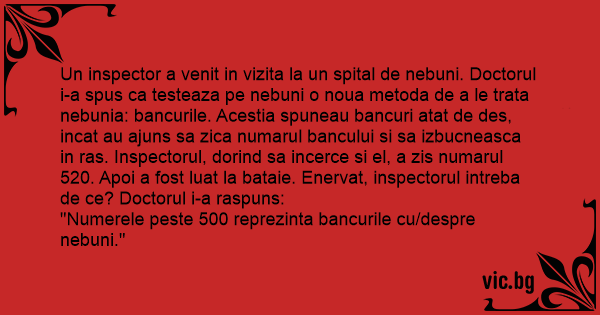 Un inspector a venit in vizita la un spital de nebuni. Doctorul i-a spus ca testeaza pe nebuni o noua metoda de a le trata nebunia: bancurile. Acestia spuneau bancuri atat de des, incat au ajuns sa zica numarul bancului si sa izbucneasca in ras. Inspectorul, dorind sa incerce si el, a zis numarul 520. Apoi a fost luat la bataie. Enervat, inspectorul intreba de ce? Doctorul i-a raspuns: