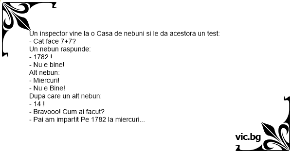 Un inspector vine la o Casa de nebuni si le da acestora un test: - Cat face 7+7? Un nebun raspunde: - 1782 ! - Nu e bine! Alt nebun: - Miercuri! - Nu e Bine! Dupa care un alt nebun: - 14 ! - Bravooo! Сuм ai facut? - Pai am impartit Pe 1782 la miercuri...