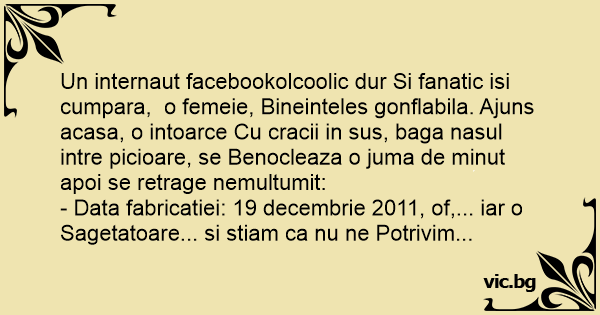 Un internaut facebookolcoolic dur Si fanatic isi cumpara, o femeie, Bineinteles gonflabila. Ajuns acasa, o intoarce Cu cracii in sus, baga nasul intre picioare, se Benocleaza o juma de minut apoi se retrage nemultumit: