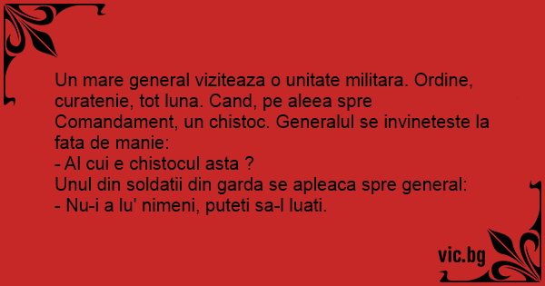 Un mare general viziteaza o unitate militara. Ordine, curatenie, tot luna. Cand, pe aleea spre Comandament, un chistoc. Generalul se invineteste la fata de manie: