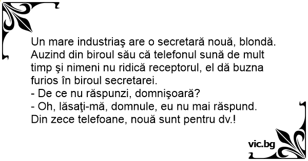 Un mare industriaş are o secretară nouă, blondă. Auzind din biroul său că telefonul sună de mult timp şi nimeni nu ridică receptorul, el dă buzna furios în biroul secretarei.