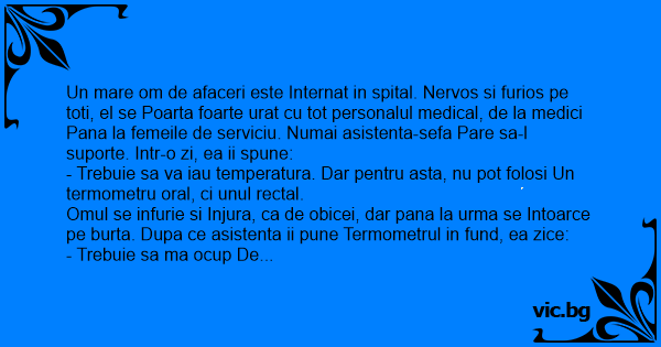 Omul se infurie si Injura, ca de obicei, dar pana la urma se Intoarce pe burta. Dupa ce asistenta ii pune Termometrul in fund, ea zice: