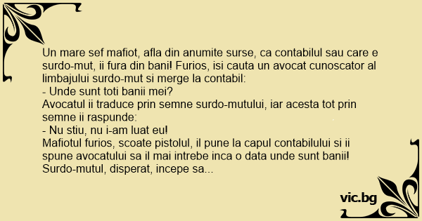 Un mare sef mafiot, afla din anumite surse, ca contabilul sau care e surdo-mut, ii fura din bani! Furios, isi cauta un avocat cunoscator al limbajului surdo-mut si merge la contabil: