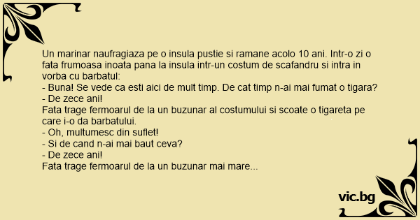 Un marinar naufragiaza pe o insula pustie si ramane acolo 10 ani. Intr-o zi o fata frumoasa inoata pana la insula intr-un costum de scafandru si intra in vorba cu barbatul: