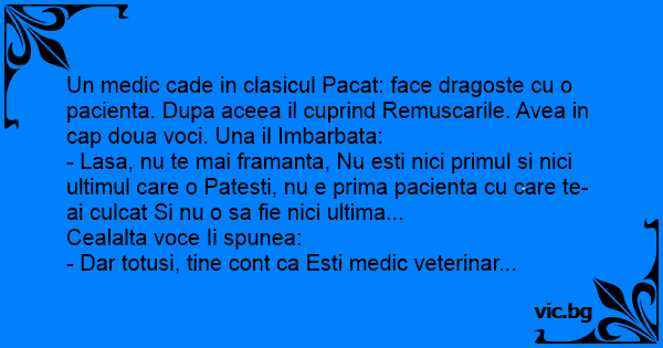 Un medic cade in clasicul Pacat: face dragoste cu o pacienta. Dupa aceea il cuprind Remuscarile. Avea in cap doua voci. Una il Imbarbata: