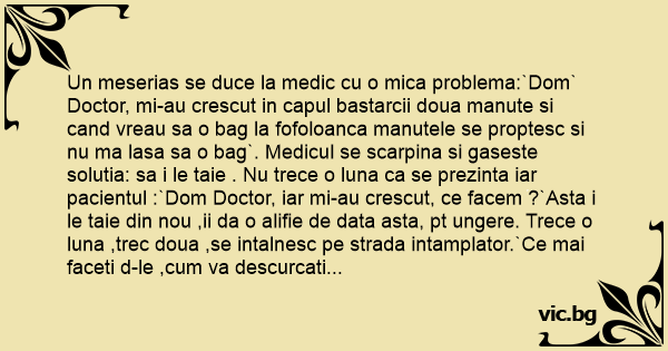 Un meserias se duce la medic cu o mica problema:`Dom` Doctor, mi-au crescut in capul bastarcii doua manute si cand vreau sa o bag la fofoloanca manutele se proptesc si nu ma lasa sa o bag`. Medicul se scarpina si gaseste solutia: sa i le taie . Nu trece o luna ca se prezinta iar pacientul :`Dom Doctor, iar mi-au crescut, ce facem ?`Asta i le taie din nou ,ii da o alifie de data asta, pt ungere. Trece o luna ,trec doua ,se intalnesc pe strada intamplator.`Ce mai faceti d-le ,сuм va descurcati ,au mai aparut manutele?`-intreba doctorul.`Da,sunt tot acolo`-`Pai, si сuм o faceti?`-`Simplu,inainte sa o bag ,ii dau cu mana peste cap si ea se apuca cu manutele de el sa se fereasca...`