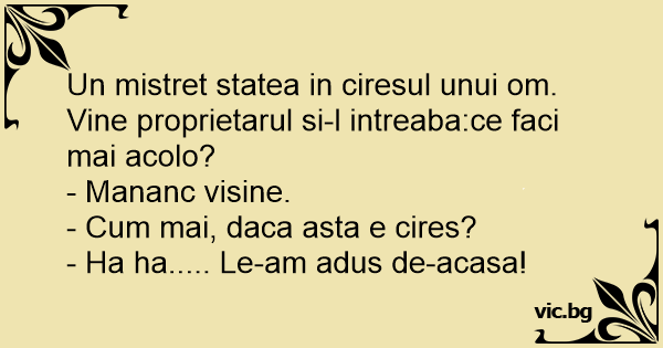 Un mistret statea in ciresul unui om. Vine proprietarul si-l intreaba:ce faci mai acolo?