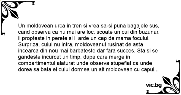 Un moldovean urca in tren si vrea sa-si puna bagajele sus, cand observa ca nu mai are loc; scoate un cui din buzunar, il propteste in perete si ii arde un cap de mama focului. Surpriza, cuiul nu intra, moldoveanul rusinat de asta incearca din nou mai barbateste dar fara succes. Sta si se gandeste incurcat un timp, dupa care merge in compartimentul alaturat unde observa stupefiat ca unde dorea sa bata el cuiul dormea un alt moldovean cu capul...