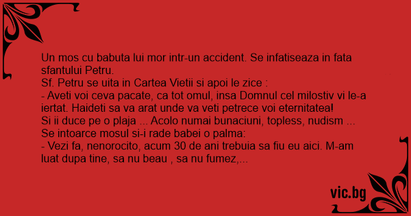 Un mos cu babuta lui mor intr-un accident. Se infatiseaza in fata sfantului Petru.