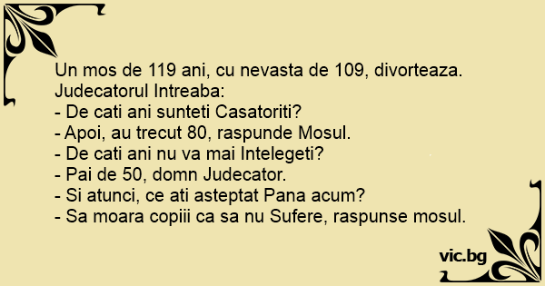 Un mos de 119 ani, cu nevasta de 109, divorteaza. Judecatorul Intreaba: