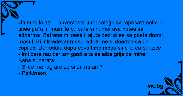 Senelių namuose susidraugavo du senukai. Vyras tarė: - Mes per seni, kad užsiimtumėm seksu. Tai gal bent gali kurį laiką palaikyti mano „džiaugsmelį“? Moteris nematė nieko blogo – ir taip jie pora...