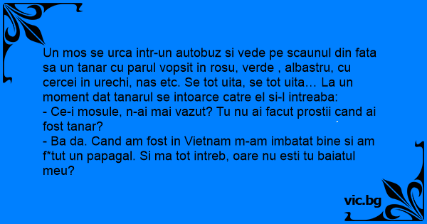 Un mos se urca intr-un autobuz si vede pe scaunul din fata sa un tanar cu parul vopsit in rosu, verde , albastru, cu cercei in urechi, nas etc. Se tot uita, se tot uita… La un moment dat tanarul se intoarce catre el si-l intreaba: