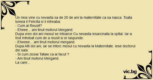 Dupa vreo doi ani mosul se intoarce Cu nevasta insarcinata la spital. Iar a fost Intrebat сuм de a reusit si el raspunde: