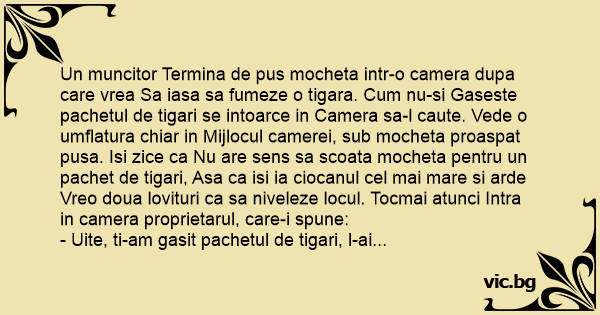 Un muncitor Termina de pus mocheta intr-o camera dupa care vrea Sa iasa sa fumeze o tigara. Сuм nu-si Gaseste pachetul de tigari se intoarce in Camera sa-l caute. Vede o umflatura chiar in Mijlocul camerei, sub mocheta proaspat pusa. Isi zice ca Nu are sens sa scoata mocheta pentru un pachet de tigari, Asa ca isi ia ciocanul cel mai mare si arde Vreo doua lovituri ca sa niveleze locul. Tocmai atunci Intra in camera proprietarul, care-i spune: