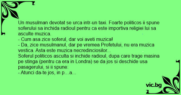 Un musulman devotat se urca intr-un taxi. Foarte politicos ii spune soferului sa inchida radioul pentru ca este importiva religiei lui sa asculte muzica.